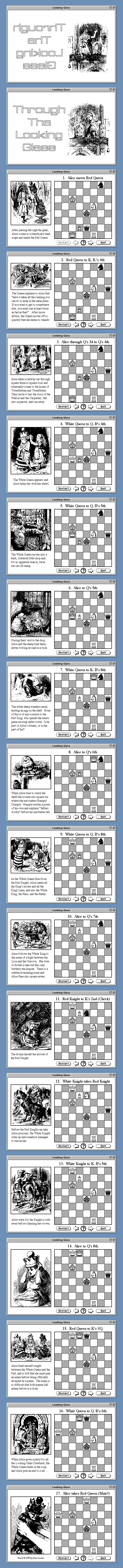 This is exactly what I hope to show with the help of this HyperCard Stack. Each movement of a piece is shown on the chessboard display one move at a time, and the corresponding story events are revealed, aided by the original John Tenniel illustrations. For those members who wish to create their own chess related HyperStacks, I have also provided a set of chess icons which can be found in the current issue of the Hyper-Talk Programmer's Library.