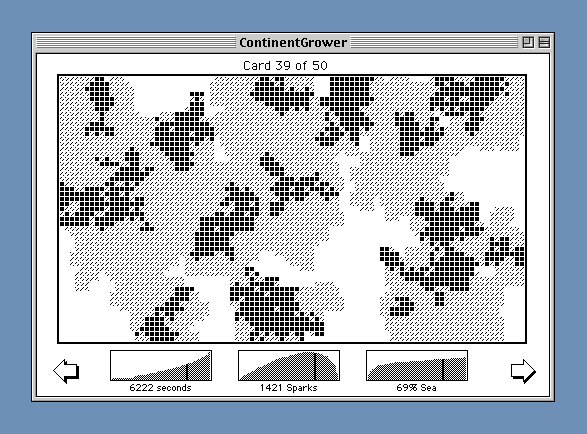 And now it's show time! Simply press the ContinentGrower button, and you will see the initial scattering of land sparks. Push the "Show Movie" button to see what happens when the simple rule is applied over and over (you can pause at any point by holding down on the mouse). You can also step from frame to frame by using the arrow buttons; tap once to advance, hold down to continue the animation.