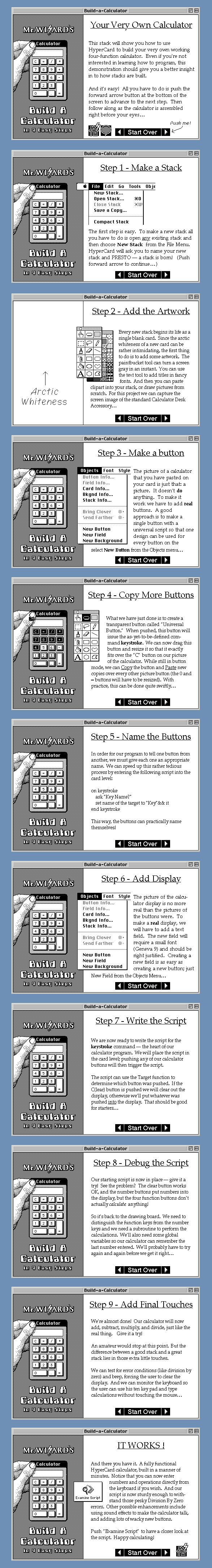 This tutorial stack teaches you how to build a working four-function calculator in nine easy steps. As you push the forward button to advance to each new step, an invisible hand moves the cursor, pulls down menus, opens dialog boxes, and clicks on buttons. On the left half of each screen, the calculator takes shape and begins to function correctly. The right half of the screen provides commentary which explains each step.