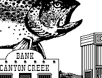 All along the way Betsy was surprising me with little presents: an attractive tie, some fine chocolates, a good bottle of wine, and even a book of Feminist Folk Tales which I read aloud to her one night as we lay in bed. We also went online one evening and shared a keyboard as we bounced from one electronic room to another. And Betsy and I collaborated to produce a clip-art postcard (see picture at left) with the slogan "I Caught The Big One in Canyon Creek, Montana."