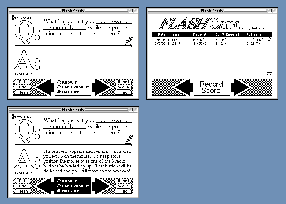 The stack also keeps score so that you can monitor your mastery of a given subject over time. After viewing each question you indicate whether you knew the answer, didn't know the answer, or were not sure. At the end of the stack is a "score card" which records the date and time you reviewed your flash cards, how many you knew, how many you didn't know, and how many you weren't sure of.