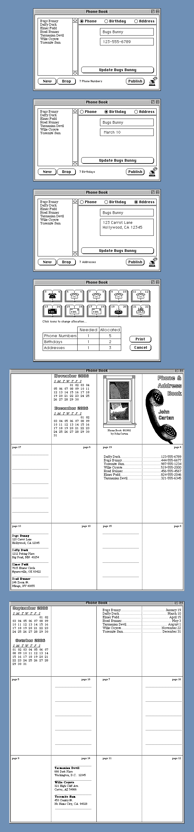 Please try at least one print-out. Although this stack still needs a little work (a help button would be nice, for example), I find it very useful. The phone book is the size of a business card and fits easily in my wallet. I usually just scribble changes and new numbers in the margins and then update and re-print once a month. I hope you all enjoy the stack. Happy holidays!