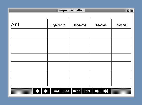My solution is a very simple stack that is easy to read and easy to add to. Each English word is given its own card. The word appears in the upper left-hand corner, and beneath it there is room for up to seven different meanings. Each meaning is a candidate for a word in Roger's language and has its own row. There are columns provided for four other languages: Esperanto, Japanese, Tagalog, and Swahili. The overall effect is much like a spreadsheet with five columns and seven rows.