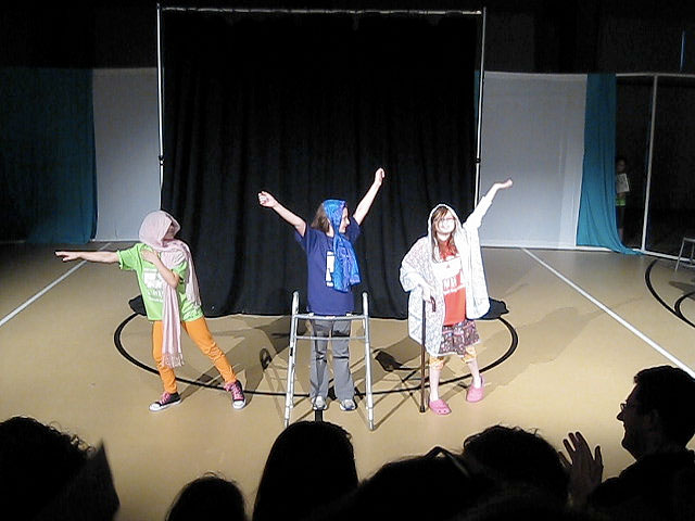 Sarah (on right, holding cane) as "Super Granny" in her school play.