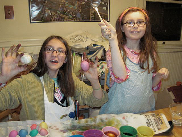 Sarah and Annika dye Easter eggs.