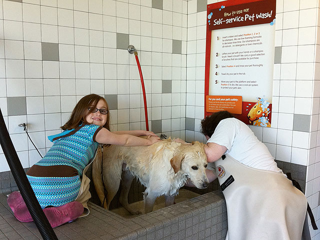 Sarah and Betsy give Lily Wonka a bath.
