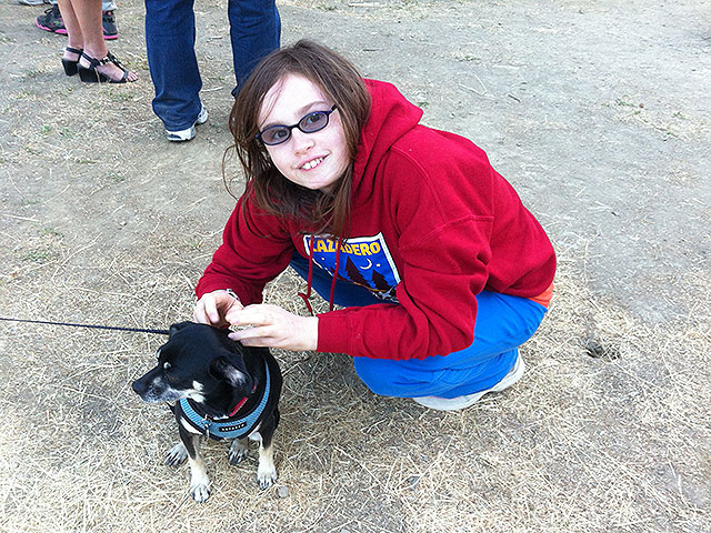 Sarah greets visiting dog during school camping trip.