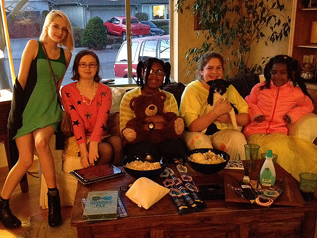 Sarah and friends at prep party for a school dance.