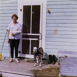 "Right down here was our house. We had three bedrooms and a big front room, a great big kitchen. We used to have parties and dances there. And we sold that house for a hundred dollars when we left, thought we was gettin a lot of money. "These here places was all lived in and belonged to different people. And that house there belonged to people by the name of Hoffman. And he run the barber shop here. And she played the piano: she was beautiful. "This road will take us up to the cemetary. I don't want to go up there. . . "That place there seems to be revenigated, don't it? Somebody must be living there. "Now this used to be, up through there, they called it tin horn alley. And that was where the prostitutes all lived. Nobody else went there. But this here is what they called old Sister Anne's place, she run a house of prostitution there. "Sister Anne lived in there, she run the alley. I knew her. She married Ray Barrs afterward. He married her and everybody was stunned because she was the Madame of that street there. "Now this is the old Elkhorn Union Miner's Hall, right above here, right there. We had our entertainments at Christmas time there, and there was a stage in there and the first piece I ever spoke, at Christmas time, was there and I remembered it so well. "I was just a little kid and they sent me out and they had a big stage and I had on a blue velvet dress and I spoke that piece. It said