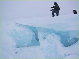 Our guide takes us out on the frozen Arctic Ocean, where we find ice the color of saphires.