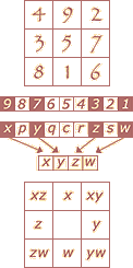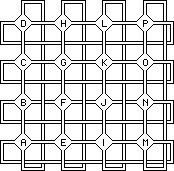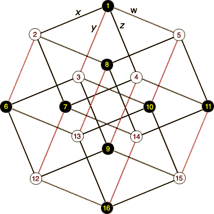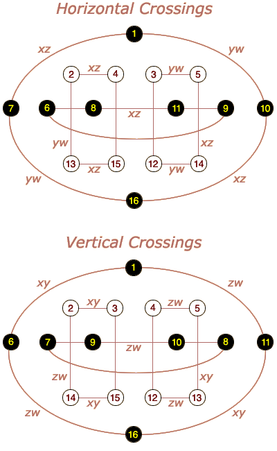 ![]() Rooms on odd levels are shown in black, even levels in white. Each yang movement corresponds to one of four types of lines (x, y, z, and w, each drawn in a consistent style and angle). For each room, lines coming in from above represent closed yang cells; lines going down represent open yang cells which lead to destination rooms. Each yin movement corresponds to a type of square. A tesseract contains 4 xz squares, 4 yw squares, 4 xy squares, and 4 zw squares (among others). Yin movements result in room changes described by traveling halfway around each square (or flipping it if you prefer). For example, there are four xz squares in the tesseract, corresponding to the northwest yin (cell 4). The first of these starts in room 1, flows down to either room 2 (along the x dimension) or room 4 (along the z dimension), then comes back together in room 7. Any movement through cell 4 will not only perform a horizontal crossing to an adjacent house, it will also cause every room number to flip to the opposite point in whatever xz square it belongs to. So if you start in room 1 at the top of the west tower and take cell 4 to cross over to the south tower, you will wind up in room 7 (just as if you had landed in room 1 and then shifted down both x and z lines in either order). Likewise, if you started in room 2 you would flip to room 4 or vice versa. And the same is true for any other xz square: 8 flips to 11, 5 to 14, 6 to 9, etc. A subsequent horizontal crossing from the south tower to the east would involve cell 6 and thus the yw squares. Room 7 would flip to room 16. Vertical crossings cause rooms to flip along the xy squares (for cell 2) or the zw squares (for cell 8). All of these movements are summarized in the following pair of diagrams: