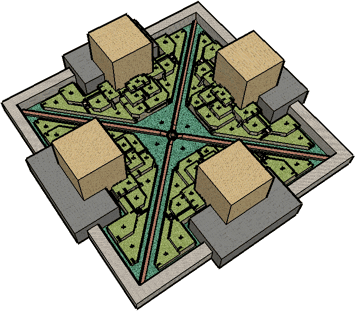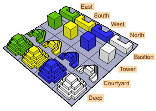 Actually, the grid of microcosms is really a flattened tesseract. But the 16 corners of a tesseract map nicely to evenly spaced points on the surface of a torus. A torus almost seems four-dimensional with its two-dimensional horizontal circles orthogonal to its two-dimensional vertical circles. But of course it's a completely three-dimensional object, as familiar as a donut. That's why it works so well as a scaffold for arranging microcosms in 3-space. This is precisely what I did to form the basic structure of the 3D starmaze. A torus is slippery, though: it's harder to label and remember positions on a torus because it is so symmetrical; unlike a flat map it doesn't have obvious rows and columns and an unambiguous lower left corner to serve as an origin. So before I could have any hope of keeping things straight, I had to develop a memorable way of positioning and labeling the microcosms. The basic idea was to assign each column in the original grid to a point on the compass: east, south, west, and north - arranged in that order to form a natural circle. To further cement the differences I associated each direction with a different landscape: east with a (green) forest, south with a (yellow) desert, west with a (blue) ocean, and north with snowy (white) mountains. I imagined the starmaze as sitting at the intersection of these landscapes, perched on a cliff at the edge of a western ocean, with mountains to the north, a desert to the south, and a vast forest to the east. (The fact that I happen to live in California may have subconsciously influenced me to make these assignments.) To each row of the original microcosm grid I assigned a different structural shape: a massive rectangular "bastion", a tall square "tower", a triangular terraced "courtyard", and, beneath the surface, a zigarat-shaped "deep". I designed these shapes to contrast with one another and to fit together neatly into a pleasing, compact layout. By this time I had already begun thinking of them as "houses" rather than microcosms.