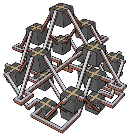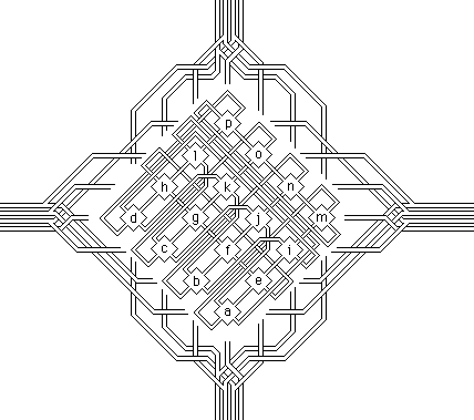 ![]() Each cycle through four rooms is accomplished by alternating back and forth between cells 4 and 6 (for horizontal crossings) or cells 2 and 8 (for vertical crossings); in practice, coming full circle requires 2 extra shifts along the way. Notice that rooms in odd levels only change to other rooms in odd levels, and the same for even levels. This means that the only way to move from an odd level to an even level or vice versa is by making a shift within a house via a yang cell. Unlike 3D objects which rotate about lines, a tesseract can rotate about any one of six different planes (or can even rotate around two at once). So another way to think about these transformations is to imagine that the 16 xyzw-tesseract houses are arranged at the 16 corners of a super pqrs-tesseract (roughly corresponding to the key points around a torus) and that each house is also rotated 180 degrees relative to its four neighbors about one of four planes (movement through dimension r causes rotation around the xz plane, etc.). This is rather mind-bending (for me at least) but shows that the seemingly random permutations of room numbers actually arise in a very consistent way from the underlying geometry of the way houses are arranged in space. Modeling these transformations require additional twists and turns throughout the crossings of the 3D starmaze. Transformations between bastions are done entirely within the great wall. Individual channels within the wall (arranged in two levels of eight channels each) dip and rise and switch back and forth like train tracks in a switching yard while the individual gradients of each channel are controlled by stairs and slides placed in a pavilion at each turning point of the wall. Bridges between towers have less space to work with, so control the gradients but leave the transformations to individual routing within the towers. Elsewhere each crossing is handled independently. Horizontal crossings at the fourth level of the deeps are handled by automated cockleshell boats.