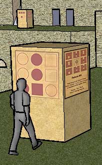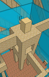 The 3D starmap reverses this. It has no need for colored pipes and cannot rely on symbols and conventions; the passages must be as efficient as possible, but cannot be intangible. In the 3D starmap it is the the inverse of a pattern that is always located in the most distant house (two horizontal crossings and two vertical crossings away) while the journey through the center is as short as can possibly be: a quick transition through a hole in the floor or ceiling. In fact, the two patterns connected through the center cell are considered to be two chambers of the same room. The upper chamber is called the "public" chamber and is always exposed to the open air. The lower or "private" chamber is always enclosed, without windows or natural light, and can only be reached via a secret passage concealed within a stone monolith that marks each room. The overall effect is not unlike a recurring dream I sometimes have. In this dream I am wandering through a large but familiar structure, my childhood home or a rambling inn that I had been occupying for some time. In the dream I find a secret passage in some dusty basement, usually a tight crawl-way that seems ordinary at first. I push in to find first one secret room, and then another, and another. Gradually I realize that there is an entire house within a house, a secret house that I never knew existed. So it is in the 3D starmaze. Not only is there a secret room concealed beneath each and every monolith, but every passage, every bridge and staircase, contains a secret passage running underneath. Those who have seen screenshots or movies of my Sketchup models, and who marvel at the sheer number of rooms and passages, are seeing only half of the maze. The other half, the private half, lies concealed beneath its floors. There are many advantages to this system. In addition to being poetic, it is marvelously efficient. Because of the way the starmaze puzzle is defined, private passages map perfectly to public passages, both shifts and crossings. The passages (hallways, stairs, slides, bridges, etc.) all have to be thickened to hold an under-passage, but the total number is cut in half. The explanation for this lies in the way the center interacts with the other cells. The chamber of a room is defined not by the state of the center cell, but by its shape: square for private, round for public; thus it is unaffected by movement through other cells. Choosing the center cell does not affect yin cells in any way, so the pattern of opened and closed crossings and destinations in a public chamber is identical to that of its private counterpart. Movement through the center cell does affect the yang cells - in fact, it inverts them. But because this creates a perfect mirror image, shifts within a private house map perfectly to its public shifts. In the public half of a house, movement starts at the top and literally slides down to the bottom. The private half starts at the bottom and works its way up until it reaches the top. To accomplish this, a stairway is concealed beneath each slide with one-way doors on either end; once you start to climb a private stairway you cannot turn back. As a result of the very different way that microcosms and houses are defined, only half of the patterns in a given microcosm reside in its corresponding house. Private chambers hold patterns from the corresponding microcosm; public chambers hold patterns from the opposite microcosm. The private starting pattern of the solution path lives in corresponding places (microcosm A in the starmap, east deep in 3D starmaze) while the public ending pattern lives in opposite places (microcosm A in the starmap, west tower in 3D starmaze).