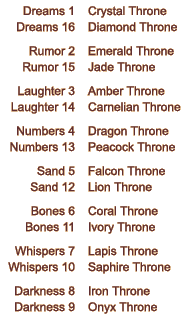The symmetry of the binary trickle causes the two throne rooms in every female house to occur in precisely opposite positions. This means that if one throne occurs in room n, the other will occur in room (17-n). In order to make these thrones easier to remember and distinguish, I have assigned each throne a name which refers to the substance the throne is made of or in some cases the decorations with which it is crafted. The five virtual levels in these virtual houses are given names instead of numbers. The room containing the throne itself is called the "seat". Crossings taken in any order lead to one of four rooms, each called a dais, then to one of six rooms, each called a step, then to one of four more rooms, each called a foundation, and finally to the terminus of the throne, always located in the opposite house from the seat. All of these rooms are said to bear "allegiance" to their throne. If I ever get around to interior decoration, I plan to mark this by placing appropriate ornaments of allegiance in every room.