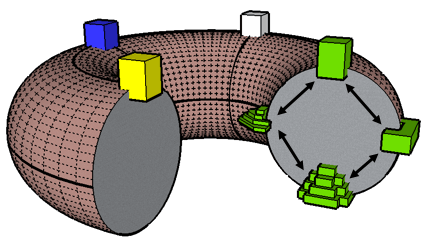 ![]() In this simplified diagram, many bridges and shafts and other details are omitted. The four triangular courtyards fit together to form a large interior square. The four bastions jut outwards in the four directions without ever actually touching the courtyards; in the space between, the four towers reach upwards. The four deeps, not shown in this sketch, lurk beneath the surface; I imagine them standing like pillars in an underground cavern. Behind the walls and beneath the surface, over a thousand individual passageways, called crossings, follow the eight great horizontal and vertical circles of the torus. The great wall encircling the maze contains passages which lead from the North Bastion to the East, from East to South, from South to West, and back to North. Bridges (not shown) form similar circles, leaping from tower to tower and vaulting the separating walls between the courtyards. Staircases wind up and down the center of each tower, connecting each courtyard to its tower and each tower to its bastion. More stairs plunge beneath the surface, connecting each bastion to its deep and its deep back up to its courtyard. Along the way, these various passages are forced to take many twists and turns, but beneath all this surface complexity lies the simplicity of a torus.