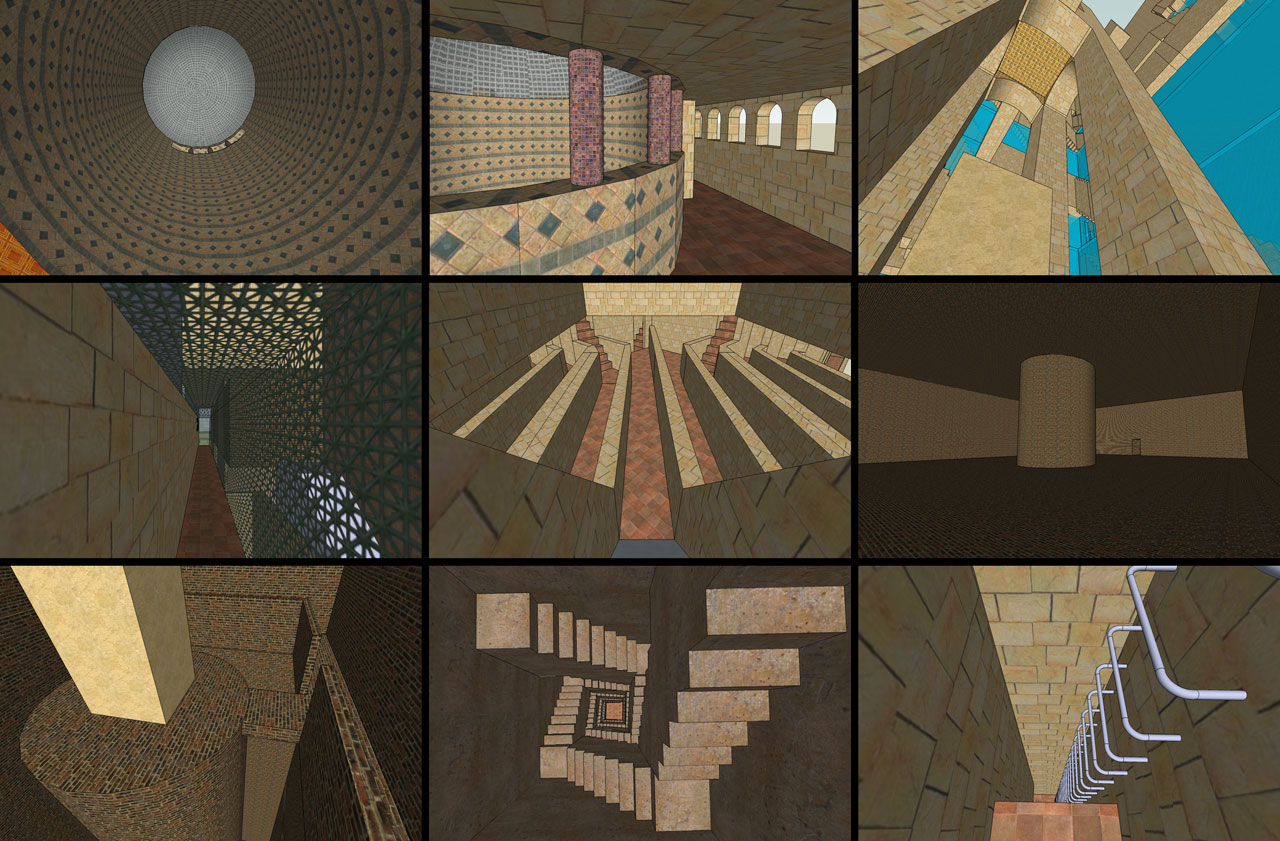 two views from the underground maze, a double-helix staircase, and a ladder.