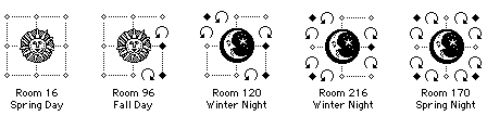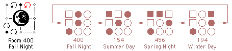 ![]() The room allocations are made in much the same way as are sun and moon rooms. Just as a sun room is defined as a binary pattern with an even number of 0s, so each room in the starmaze can be assigned a unique season as follows:
