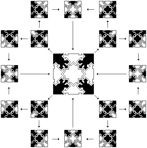 Is it always possible to choose directions for each edge in an n-cube to achieve the maximum possible number of cycles? The answer is yes - and this is where the concept of seasons proves useful. Once you assign a season to each of the 2n corners of an n-cube you can then use seasons to determine the direction of every edge by saying that Spring always leads to Summer, Summer to Fall, Fall to Winter, and Winter to Spring. The result would be an n-cube with the maximum number of possible cycles, each cycle containing 4 seasons all moving in a forward direction. If you applied this technique to a 9-cube, for example, you would have a structure with no source and no sink. Every Spring and Fall corner would have five incoming edges and four outgoing edges; Every Summer and Winter corner would have four incoming edges and five outgoing edges. Dimension 5 would be just another yang dimension, not a special "center" dimension. One consequence of this is that, unlike the starmaze, moving through the center would not change the time of day (sun to moon) without affecting the season. So every Spring and Fall room would be a moon room and every Summer and Winter room a sun room. There would be no Spring days or Winter nights. If we created patterns for every corner in the same we we do for the starmaze, half the patterns would have all the yang cells open (forming a cross) and the other half would have all the yin cells open in the four corners. Each move would jump from cross (sun) to corners (moon) or back again and the only difference between one cross pattern and another would be in its configuration of squares and circles representing the underlying binary address. Adjacent rooms would sometimes be three steps apart instead of just one because there would be no backward cycles; getting from a Spring room to a Winter room would always require three steps. It would still always take at least four moves to travel from a room back to itself, but there would always be exactly 20 different ways of doing this - so every room would be a 20-ring room. This maximum cycle maze/puzzle is also a minimum coverage puzzle because it has only two patterns. As discussed in Puzzle Keys, the set of minimum coverage puzzles includes a set of maximum cycle puzzles. For order 9 puzzles, we expect to find the cross and corners puzzle just described, its inverse (which works the same way except that all the cycles run counter-clockwise), and 250 other variations which use different permutations of 4 or 5 open cells in each pattern). It's not yet clear whether or not all maximum cycle puzzles are minimum coverage puzzles. The starmaze, then, is not the same as this "maximum cycle" maze, even though both are built on a 9 cube and both have exactly the same allocation of Spring, Summer, Fall, and Winter rooms in exactly the same locations. The difference is in the way the directional arrows are assigned to each of the 2304 edges of the 9-cube.