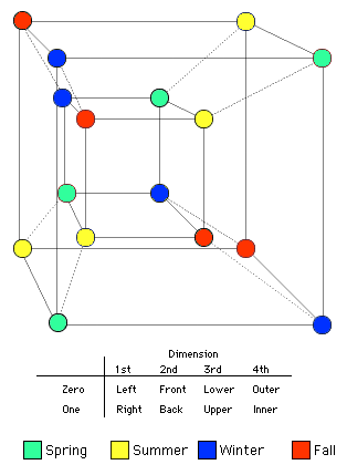 GeometryThis system of assigning seasons can be made to work with any hypercube. So we can understand these seasonal cycles from a geometric point of view by considering the (relatively) simple case of the tesseract. One way of visualizing a tesseract is as an inner cube located "inside" an outer cube. Traditionally, yin is associated with even numbers and yang with odd numbers. So if we define the 1st (left/right) and 3rd (lower/upper) dimensions as yang dimensions and the 2nd (front/back) and 4th (outer/inner) as yin dimensions, and then apply the above definition of seasons, we can assign each room (corner) of the tesseract a season as follows: