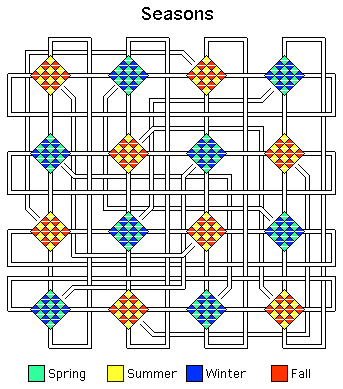 SeasonsAs we've seen, each cycle in the starmaze follows a consistent sequence, cells A, B, A, B where A and B are two adjacent non-center cells, A initially open and B initially closed. If cell A is a yin cell, then this sequence is yin, yang, yin, yang. In the starmap, this translates as a journey through a macropipe to an adjacent microcosm, then a micropipe to an adjacent room, then a macropipe back to the original microcosm, then a micropipe back to the staring room. Similarly, if cell A is a yang cell, then the sequence is yang, yin, yang, yin - or micropipe, macropipe, micropipe, macropipe.We can take advantage of this consistency to define the concept of seasons. Each room in the starmaze can be assigned a season (128 spring rooms, 128 summer rooms, 128 fall rooms, and 128 winter rooms) so that each cycle in the maze contains all four seasons. As you can see on the starmap, the room allocations are completely interspersed so that seasons change with every move through a micropipe or macropipe: