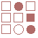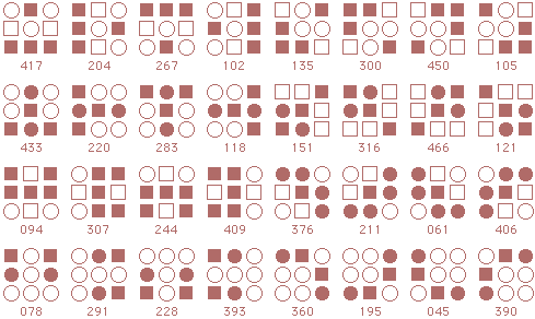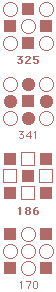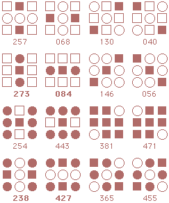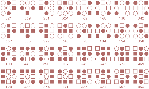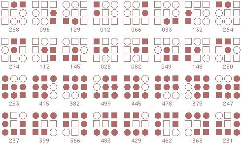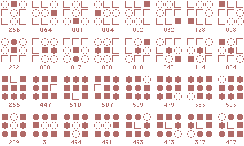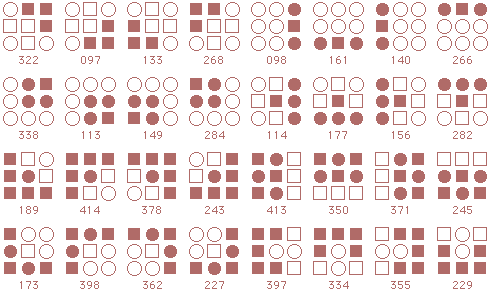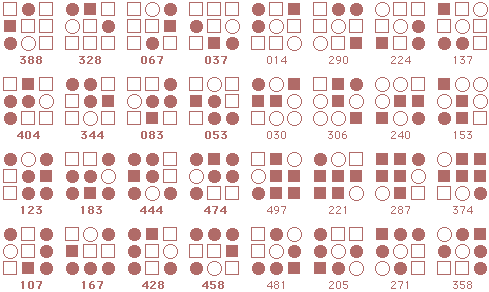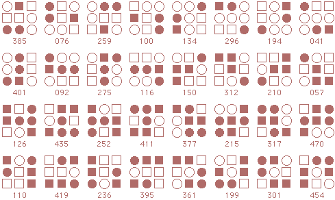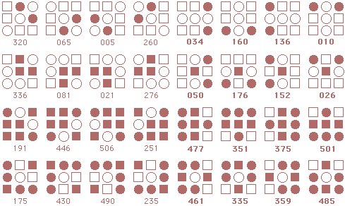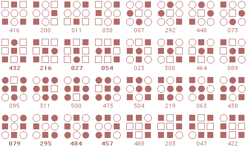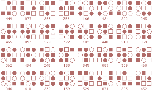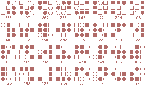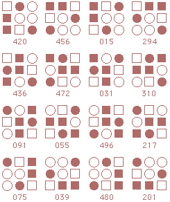 ![]() The starmaze is a hall of mirrors. Every pattern is surrounded by a kaleidoscope of reflections and rotations and inversions that make simple relationships seem more complex than they really are. Forms are an attempt to reduce that kaleidoscope to something more manageable. In particular, this page shows how forms can uncover the common structure lurking beneath the thousands of varied solutions to the original starmaze puzzle. Each form consists of all the unique rotations and inversions of a pattern with and without an open center cell. By clumping together these rotations and inversions, the 512 different starmaze patterns are reduced to one of 20 basic forms. Most forms include a total of 32 patterns - 8 basic rotations, doubled once to include a flipped center cell and doubled again to include all the inverses. The more symmetrical patterns have fewer unique rotations and so include fewer patterns. Three of the forms have only 4 unique rotations, one form has only 2 rotations, and the final two forms have only 1 rotation. The forms are arranged in order of the number of stars (open cells) in the initial pattern. The first form has one star, forms 2 to 5 have two stars, forms 6 to 12 have three stars, forms 13 to 19 have four stars, and the final form has no stars.