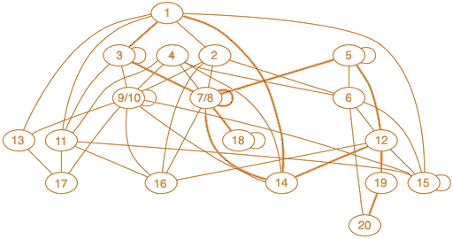 Every movement within the maze causes a transformation of one form into another. Each form can change into 2 to 9 other forms. Only 4 of the 20 forms can change into themselves. The transformations are commutative; if A can transform into B, then B can transform into A. Forms 7 and 8 are reflections of each other; each can transform into its reflection and to the same set of other forms. The same is true of forms 9 and 10. So both of these pairs are combined in the following transformation chart: